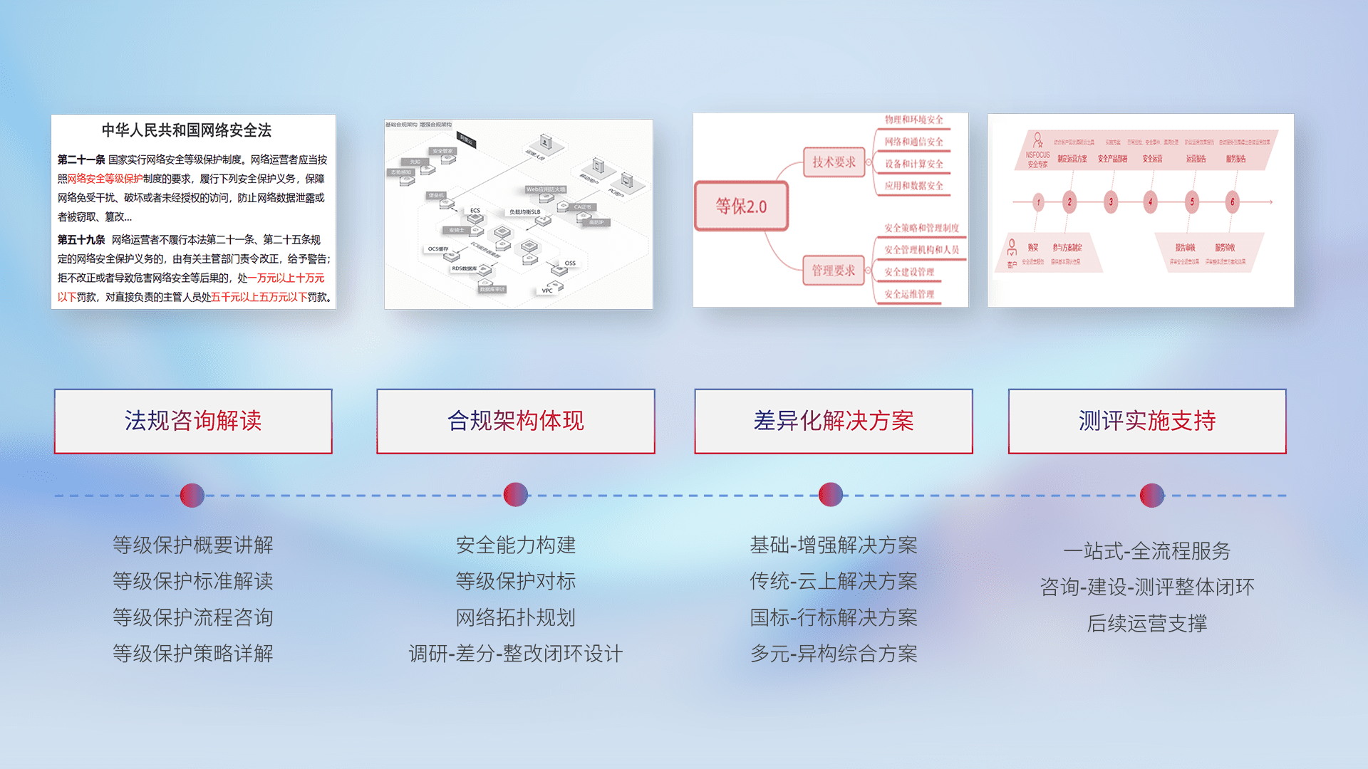 通过专业的法律咨询解读、、、、合规架构体现、、差异化解决方案、、、、测试实施支持等服务,,,为客户量身打造等保合规体系。。。